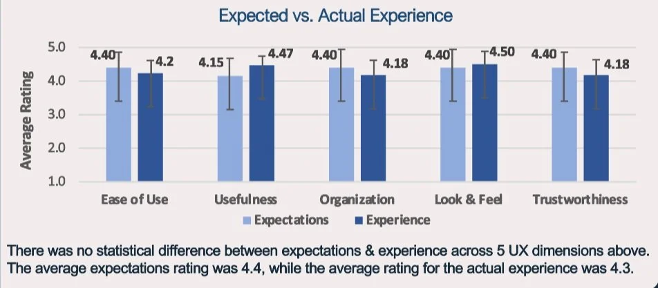 Prior to any tasks, participants rated their expectations on a scale of 1-5 (5 being the highest). Ratings included four dimensions; easy to use, useful information, organization, and look & feel. After completing the tasks, they were asked to rate the site based on these criteria again.